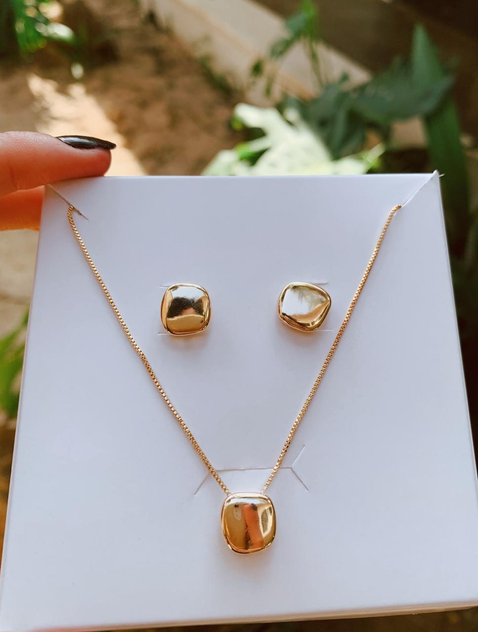 Kit Gold Brinco E Gargantilha Quadrado Liso